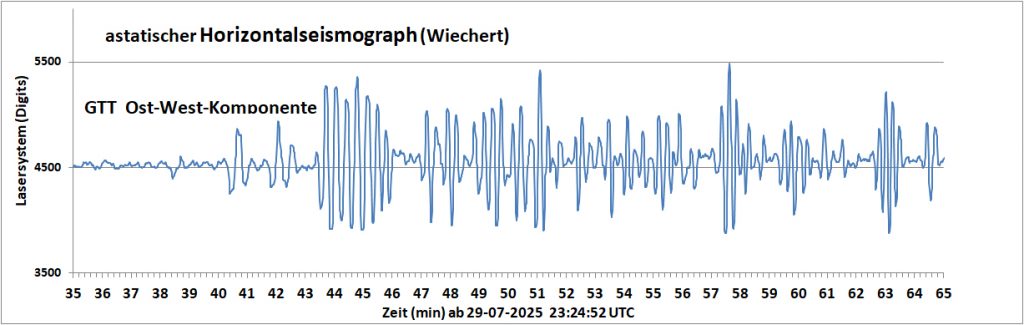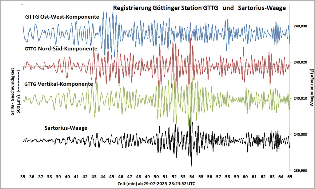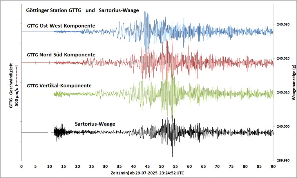 Die schnellsten Raumwellen (P-Wellen), die durch das Erdinnere laufen, erreichten die 8100 km entfernte Wiechert‘sche Erdbebenwarte Göttingen nach 11,5 Minuten und wurden dort von allen Seismographen registriert – dem modernen Breitbandseismometer der Station GTTG, der hochauflösenden Sartorius-Waage und den historischen Wiechert-Seismographen (siehe Abb. 1 und 2).